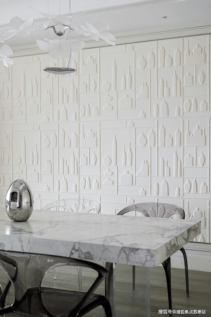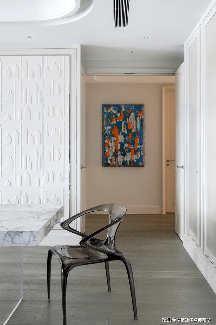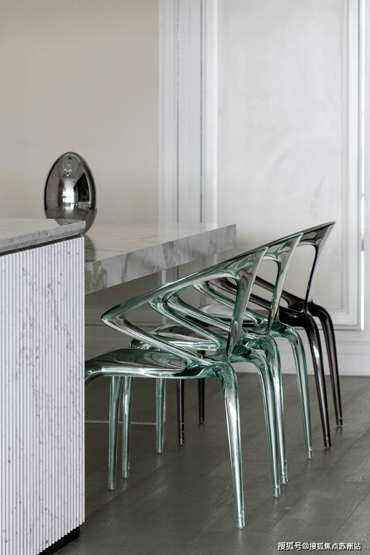 就餐厅暂离传统的固定设计方式,采用更新颖的设计方法缔造潮流惊喜。餐桌联合岛台,扩展用餐面积,赋予更加灵动洒脱的形态。另外通透亚克力支柱呈现的隐身姿态,赋予空间更温馨淡然的氛围。