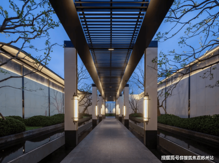 第二进·和光。天光,是来自天空的诗意。从庭院通往会所,约20m长的梁桥浮水,营造出幽深绵长的唯美场景。阵列柱廊有迎宾之意,两侧特选乌桕将自然与光影完美诠释,漫步其中,对话苏河古今。