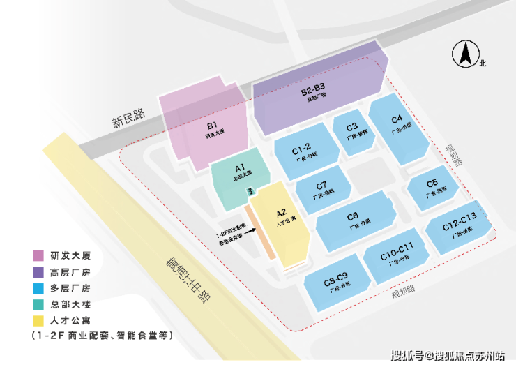 整个园区包括高层厂房2幢、多层厂房9幢、办公研发楼1幢,还有生活配套楼(人才公寓)1幢。