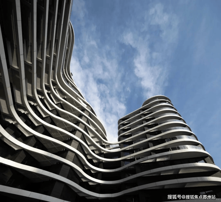 项目外立面采用玻璃幕墙现代简约风。建筑轮廓曲线蜿蜒,呈波浪线型层层迭高并后退,时尚感非常强。