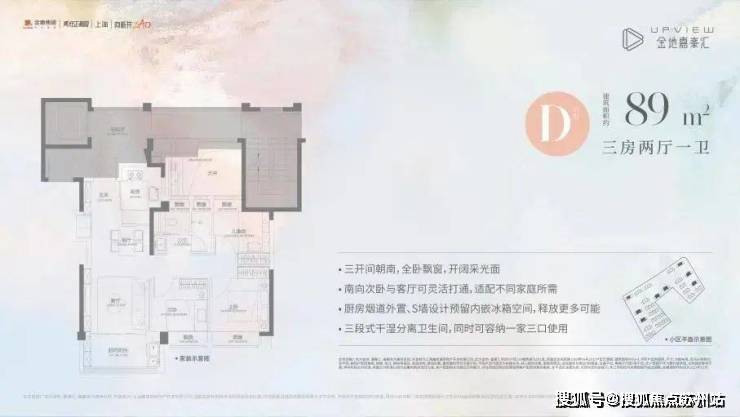 于嘉定新城的改善客户,可能之前住的是步梯的老房子,南北不通、格局压抑,功能间不够,装修差。那在金地嘉峯汇户型和装修上,你能得到全维度改善,很多前沿的设计让你的生活得到质的飞跃。项目主力在售建面约89-102㎡3房,其中建面约89㎡3房: