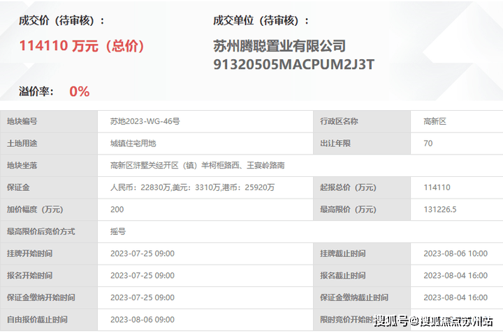 2023年8月6日,苏地2023-WG-46号地块由苏州腾聪置业有限公司竞得,楼面价约11414元/㎡。
