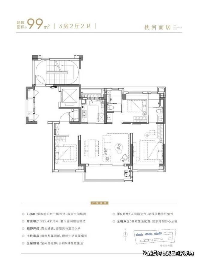 建面约99㎡滨水高层户型方正,功能性与尺度感兼得,在保证采光的同时,呈现开阔的空间场景。