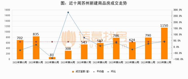 进入2025年第12周(03月17日-03月23日),苏州新建商品房成交1150套,较上周增加360套,环比上涨45.6%