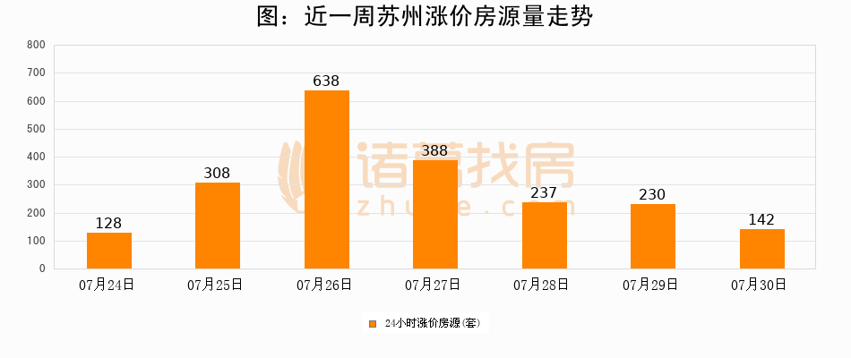 根据诸葛找房数据显示,苏州24小时涨价房源量为142套,较07月29日减少88套,环比下降38.3%。与此同时,涨价房源占比小幅回落,对于购房者来说是一个入市窗口期,购房者可抓住时机入市。