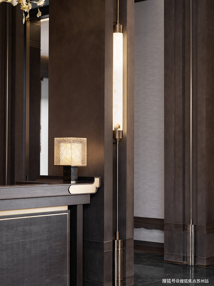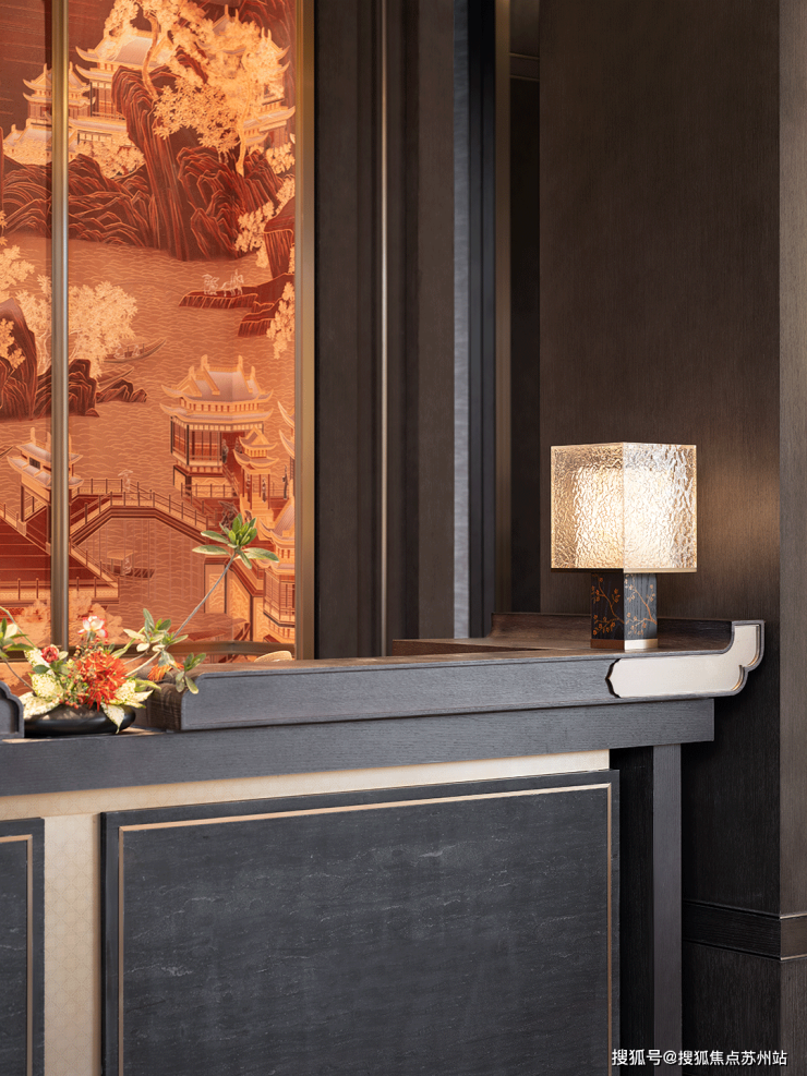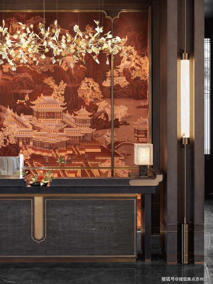 芙蓉池中芙蓉花,从池中蔓延至空间,寓意一路荣华。朱红墙上一抹金光,投射在芙蓉花背面,以光勾勒出的花型,尊贵典雅。