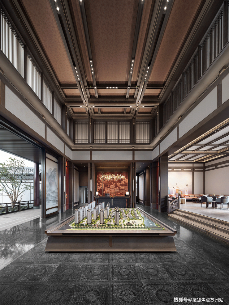 二层挑高使得展示区更宽敞,以现代结构及材料诠释屋顶的线条,精致简洁,颇显先进名家气度。暗红色的画卷,描绘着宏伟的楼阁,繁华盛世彰显。