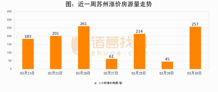根据诸葛找房数据显示,苏州24小时涨价房源量为257套,较03月29日增加212套,环比上涨471.1%。与此同时,涨价房源占比小幅扩大,业主信心有所提升。