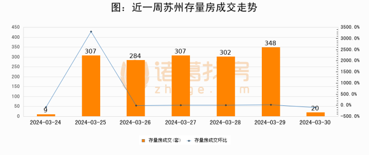从存量房来看,2024年03月30日苏州存量房单日成交20套,比昨日减少328套,环比下降94.2%。从近一周存量房成交来看,苏州存量房日均成交套数为225套,03月30日单日成交20套,低于近一周平均水平91.1%。
