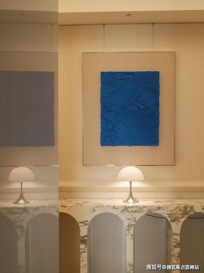 静安翡丽铂悦官方电话➡:400-8123-664(预约看房电话)玄关处的大花白大理石端景台完美融入场景,半圆弧线条与美式竖条纹墙面和谐共生。由设计师和业主夫妻三人共同创作的装饰画,灵感来源英国抽象艺术家杰森·马丁的画作,厚重而又细腻的纹理为空间注入艺术灵魂,克莱因蓝的点缀为整个空间增添一抹亮色。