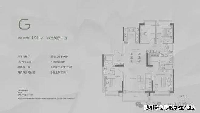 综合评价:229㎡的舒适四房,格局和A户型类似,只是房间尺度上有些差别,各个空间尺度也很充足,功能配置也很齐全,也考虑了洗衣空间,次卧套卫生间是暗卫,整体来说户型也很不错