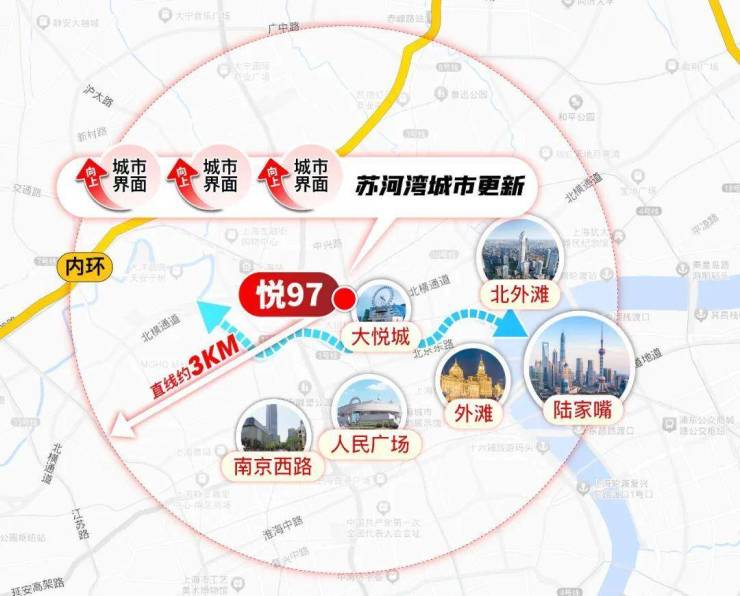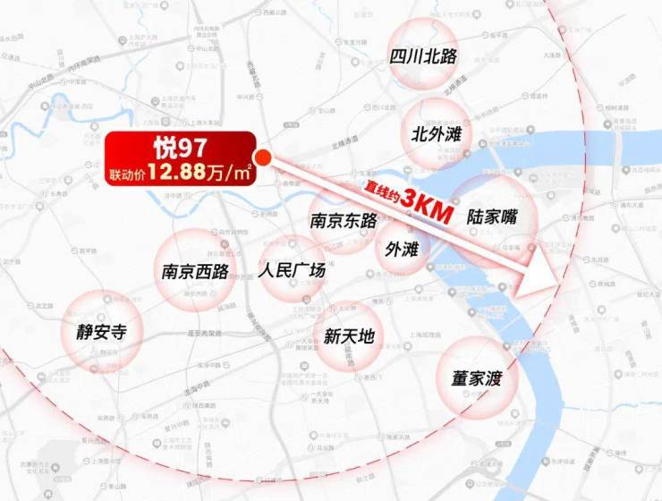 如果不拘泥于步行,视角放大到3公里半径,范围内江涵盖陆家嘴、人民广场、静安寺、南京西路、南京东路、外滩、新天地等城市CBD,上海几乎所有的高能级城市资源都在悦97业主的生活场域之内,这一点也是徐汇滨江难以比拟的!