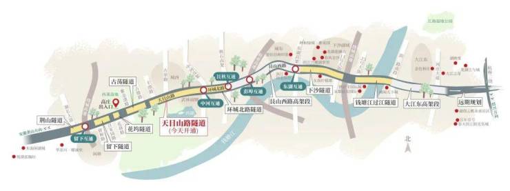 纵向的青六路,跨过东沙湖直连江东大道快速路、钱塘快速路,过江仅需一首歌的时间,去武林广场也仅仅30分钟左右。