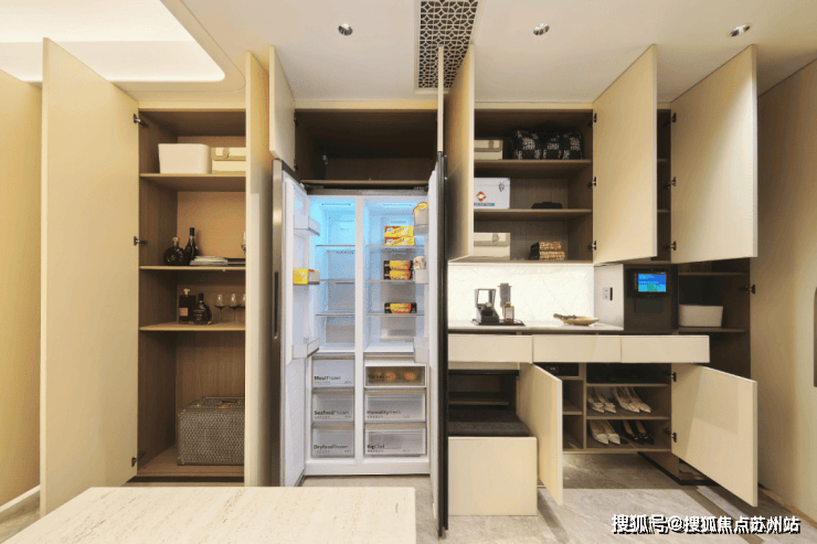 看到约143平户型,厨房岛台和上柜都不稀奇,厨房外的半开放式餐边柜和利勃海尔内嵌式同样也作为交付标准附赠,柜体额外提供接近1立方面积的收纳空间: