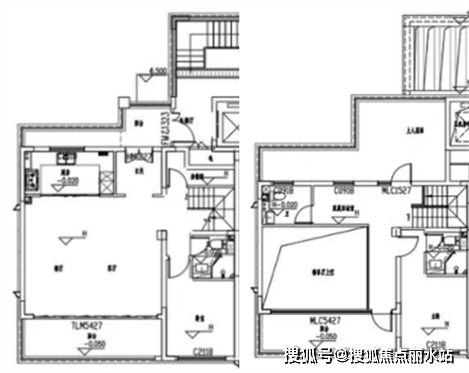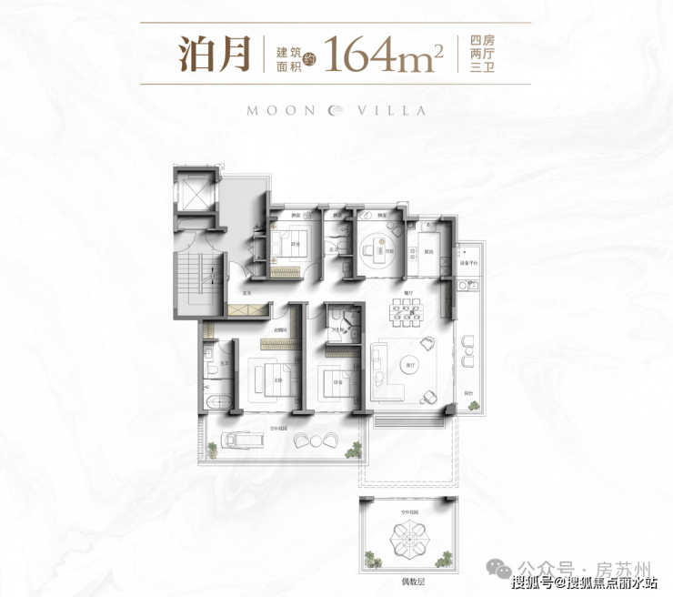 上叠建面约176㎡,客厅挑高,经改造同样可做4房3卫,南北双露台+星空屋顶露台。