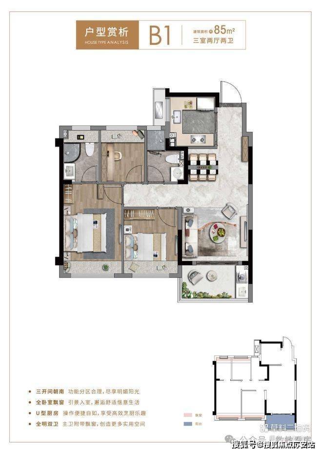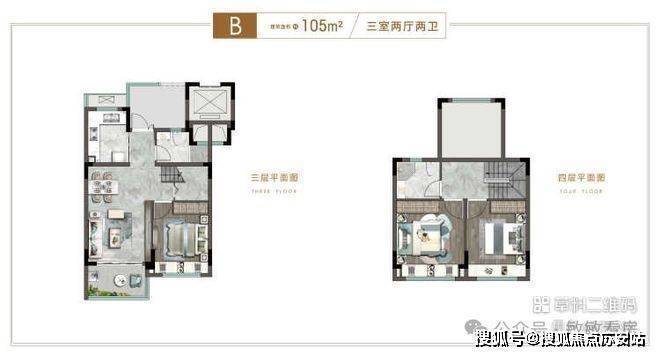 B户型建面约105㎡,三房二厅三卫