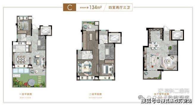 C户型建面约134㎡,四房二厅三卫