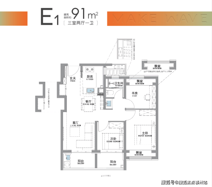 “南向双阳台+南北双飘窗”,构筑真3房户型!