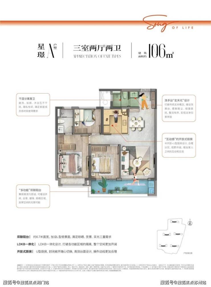 约106㎡户型点评:双联阳台约6.7米面宽,加设L型俯景面,满足晾晒、赏景、采光三重需求,LDKB一体化设计,打破各功能区域的隔离,整个空间更加开阔,开放式厨房U型厨房,封闭敞开随心切换,高效台面设计,操作动线更加合理