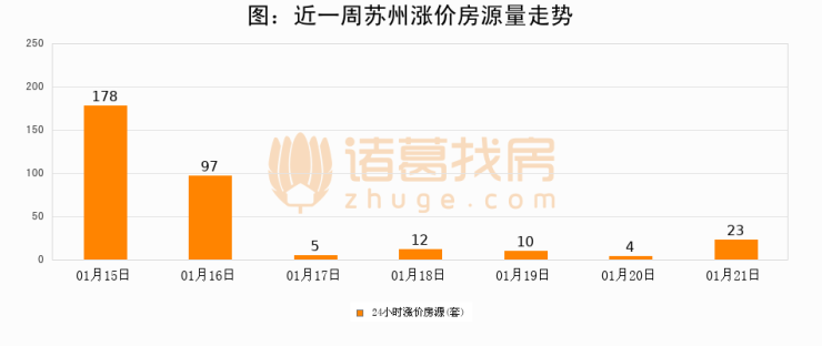 根据诸葛找房数据显示,苏州24小时涨价房源量为23套,较01月20日增加19套,环比上涨475%。与此同时,涨价房源占比小幅扩大,业主信心有所提升。