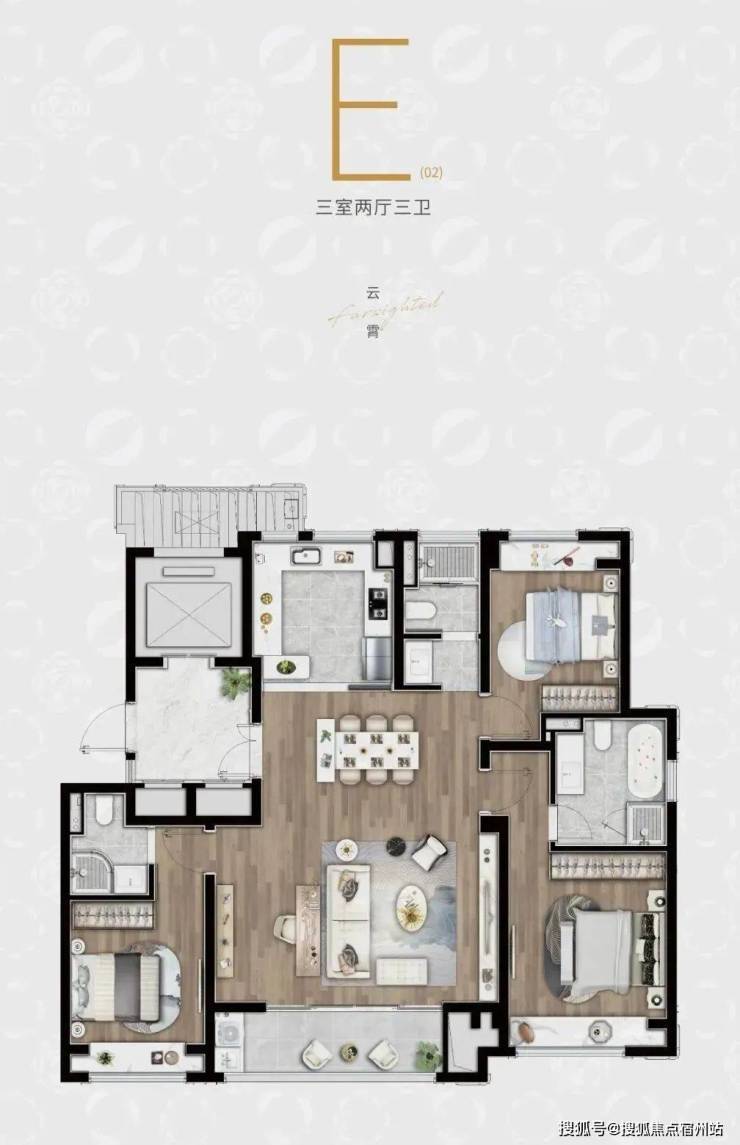 约98㎡3房2卫户型,三开间朝南,并且这贯穿客厅+次卧的超大阳台实在是惹眼,这个南向的视野延展度以及采光度相比同级别的户型来说,要更加出色.