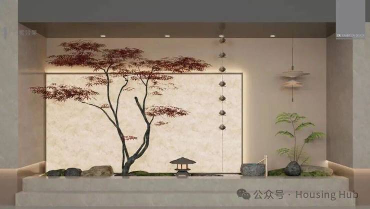 以原生奢石光影留白,巧妙运用黑白砾石作为地面铺装,精心挑选红枫、迎客松以及竹子等仿真树植巧妙植入其中,如同一幅生动的水墨画,为归家之旅增添了几分山水层次与意韵深度。