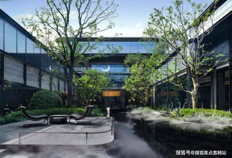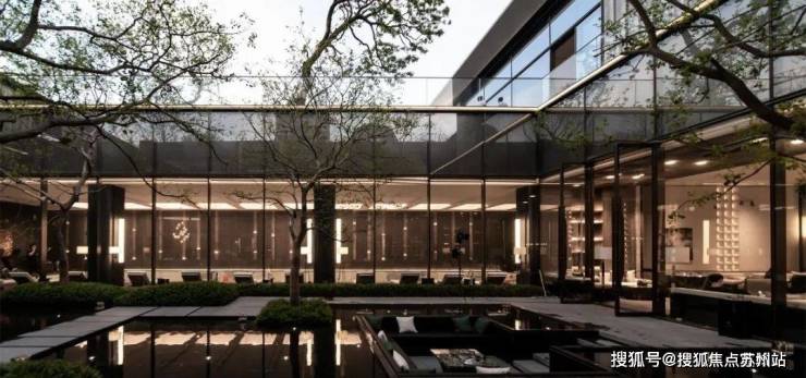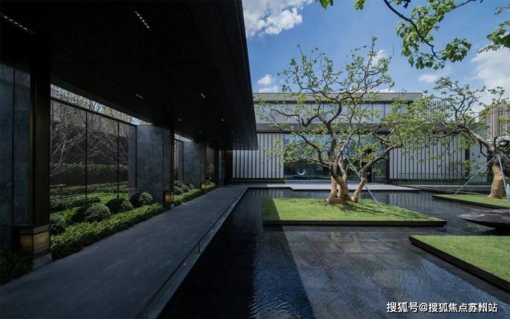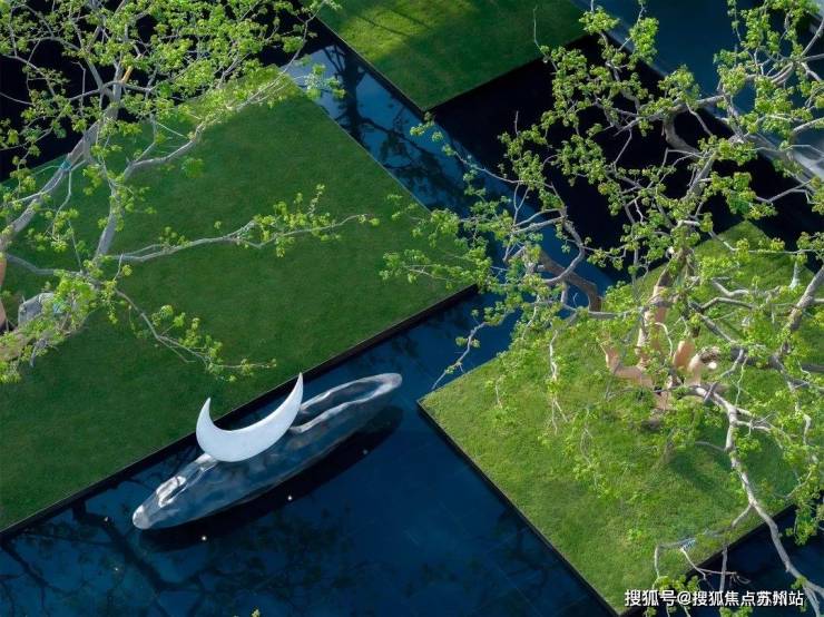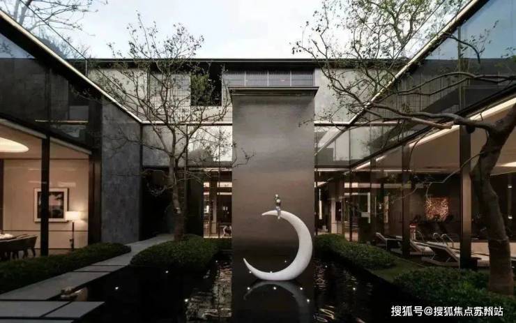 他们放大了树和水的元素,主要选用树王级稀贵树种,大面积的下沉式镜面水庭(东吴御湖境琉璃庭院约230㎡,未来御湖境明月鎏光水院近400m²),中间缀以石材形成岛屿般的汀步、蜿蜒的岸线、碧波枕弦月,弧形的运用让艺术美感在园林里自由穿梭,也辗转出不同的场景韵味。