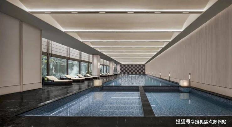 它的御上泳池,整个泳池是标准的三泳道25m×7.5m,空间布局贴心地分为成人泳池、儿童区和按摩池;并且它已经不满足于恒温这一单一的功能性了,是更为先进的五恒系统,可以做到恒温、恒湿、恒氧、恒洁、恒静。