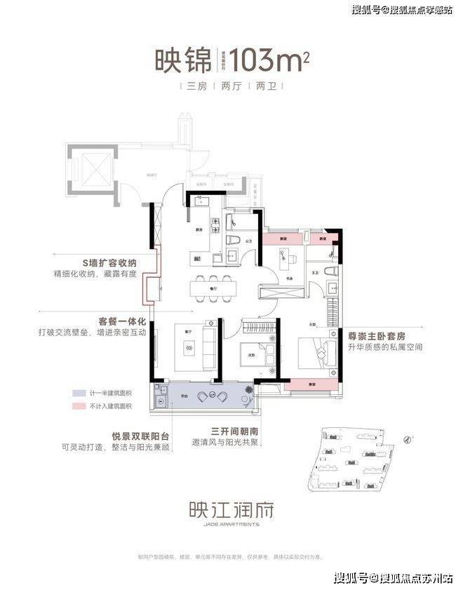 亮点五:双联阳台+多飘窗赠送、灵动空间。映江润府103户型,实现了100平级别难得的双联阳台,实现了室内空间的横向延伸,同时,搭配主卧、主卫、书房的“全飘窗”设计,赋予了空间更多灵动的使用场景。 华润映江润府售楼处热线:400-8787-554