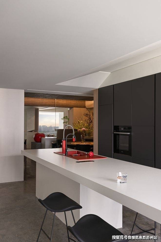 厨房、餐厅、吧台的结合十分轻盈,松弛的生活态度随处可见,厨房位于角落处,让油烟终止在角落,为其他区域带来了更多的舒适感。