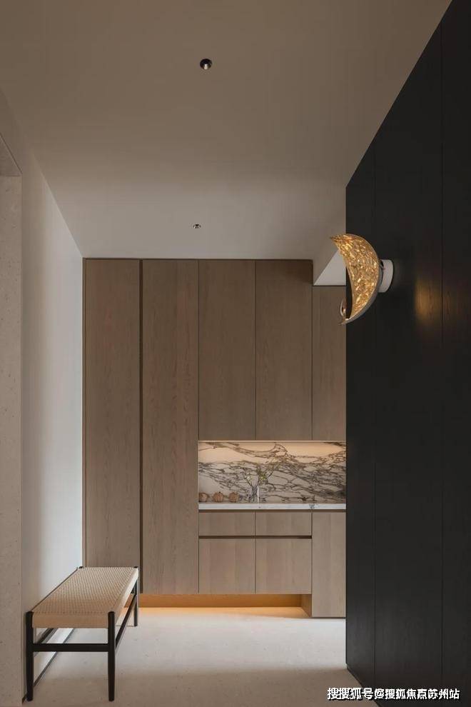 我们有意识地避免过度装饰,追求一份随性自在的松弛。空间中的质感、肌理、颜色给人的感触是温润的。深黑素雅的墙面,给予想象的静谧感;在暖色光源的照射下,如同温柔的拥抱;天然洞石拥有接近自然表皮的肌理,有着拙朴之美,带给人安定的情绪。
