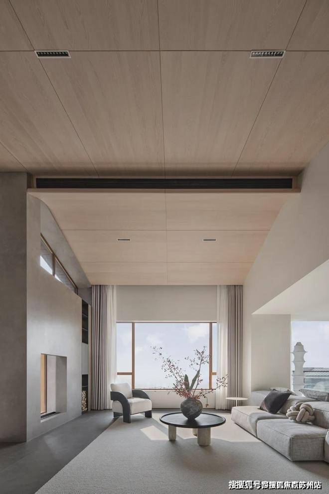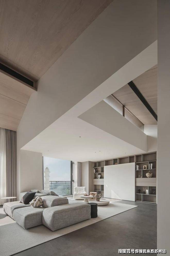 坡形顶的设计不仅提高了空间的视觉高度,也增加了空间的层次感和个性化艺术美感。通过巧妙隐藏空调风口等设备,整体空间变得简约干净。