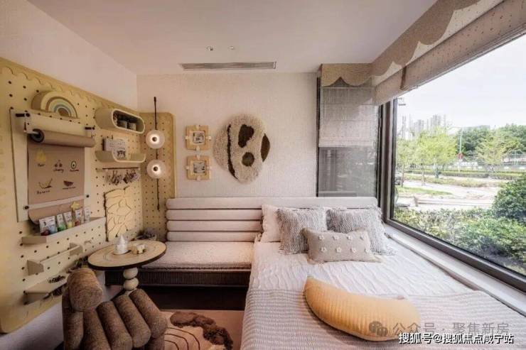 建面约122㎡创意展示间实景,具体以实际交付为准,这个尺度感一般也只有在约140㎡以上的大平层中能看到。主卧豪华套房的设计+约270°的巨型飘窗,这个尺度感和实用性真的很强。