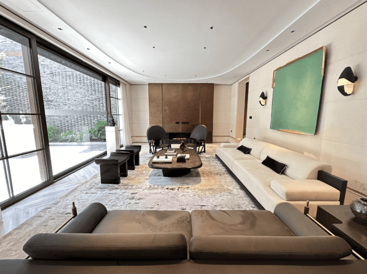 整体一层空间的东南方向,样板间设计为了茶室,配合西向落地玻璃窗,同样正对庭院。