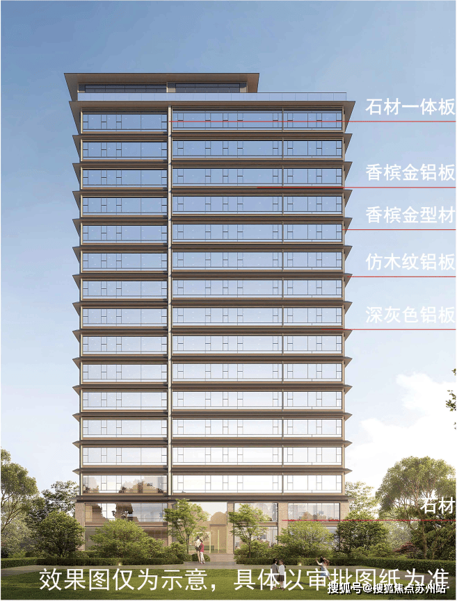 从小高层外立面效果图来看,项目采用 全铝板、石材、石材一体板搭配南向大面积玻璃幕墙,从远处看,仿佛没有墙体构成,在阳光照耀下非常通透,不仅拓宽了观景视野,而且采光通风也非常充足。