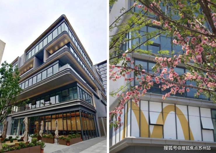 架空层深灰色石材与古铜色金属组合,屋顶彩釉玻璃搭配香槟金铝板,营造历久弥新的建筑质感
