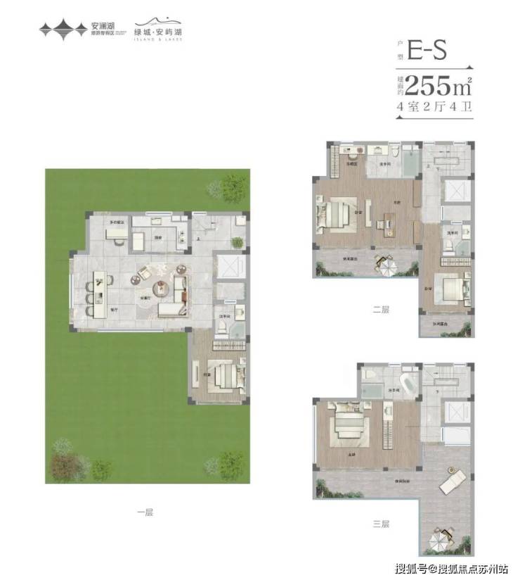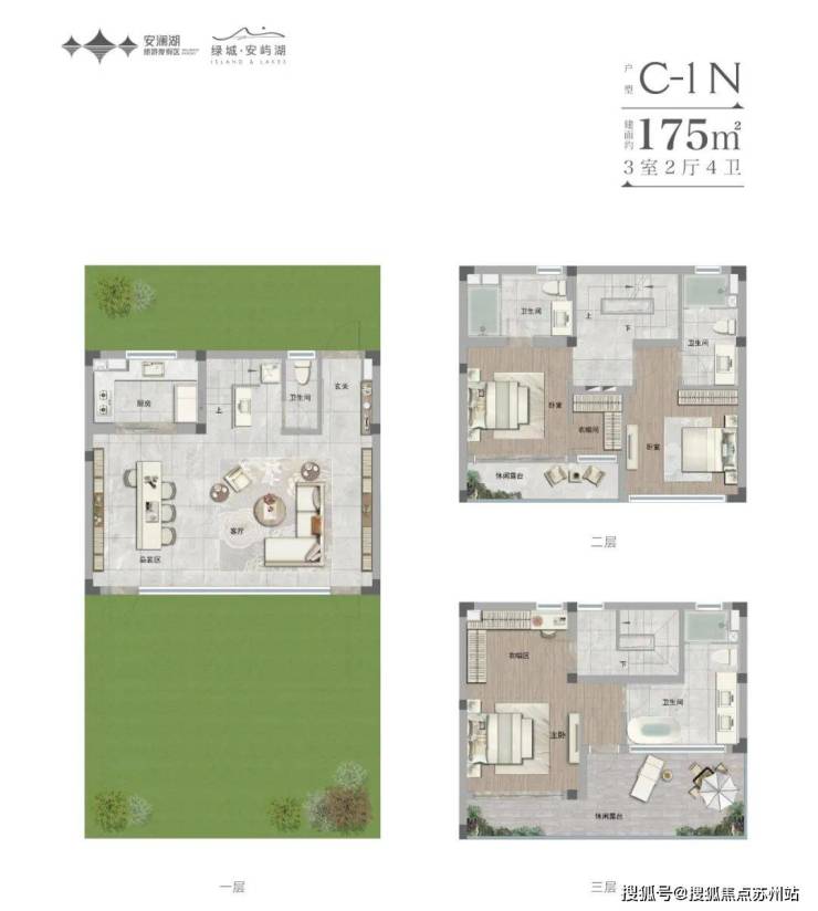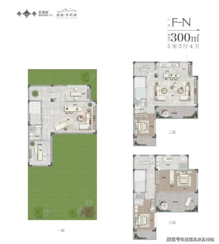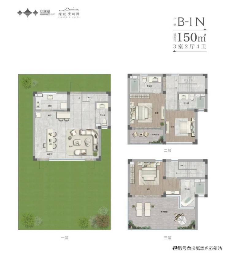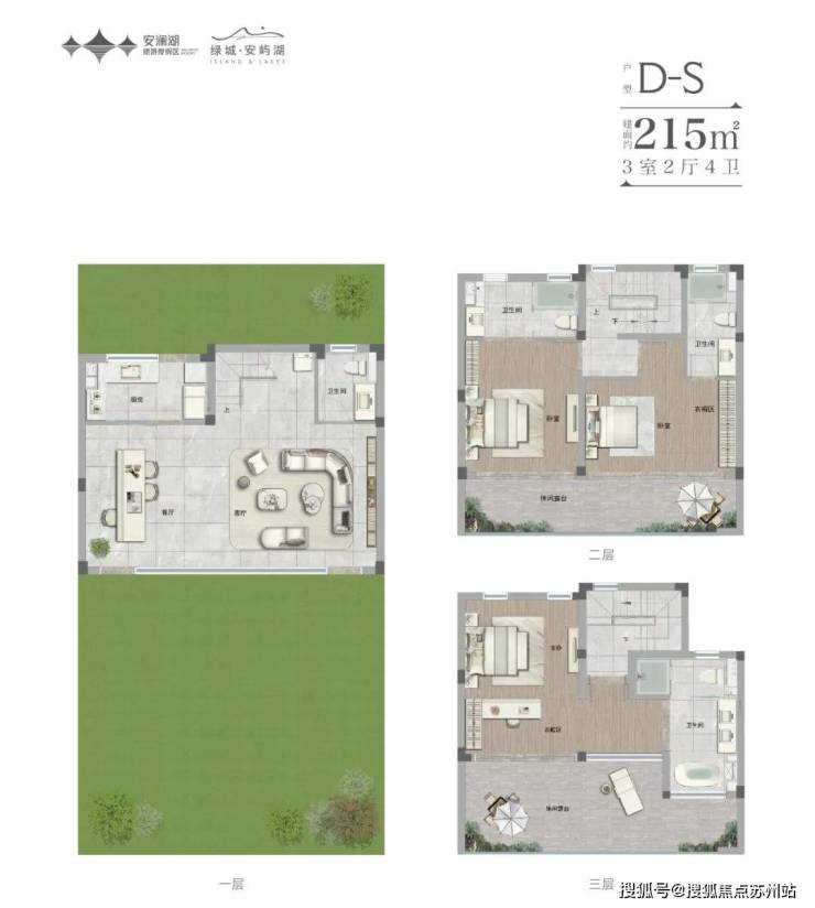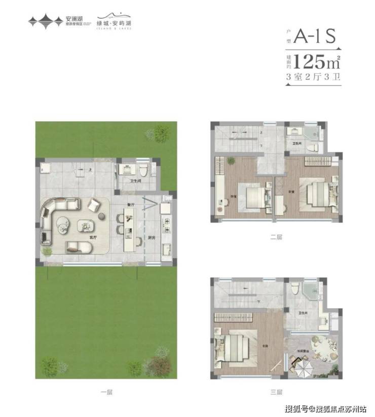 ➤➤以约125㎡的3房3卫为例,一楼是南向餐客厅+大花园,二楼是2个南向主卧,三楼则是带南向大露台的主卧套房。每一个房间,都向湖面与阳光打开。
