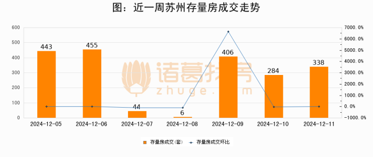 从存量房来看,2024年12月11日苏州存量房单日成交338套,比昨日增加54套,环比上涨19%。从近一周存量房成交来看,苏州存量房日均成交套数为282套,12月11日单日成交338套,高于近一周平均水平19.9%。