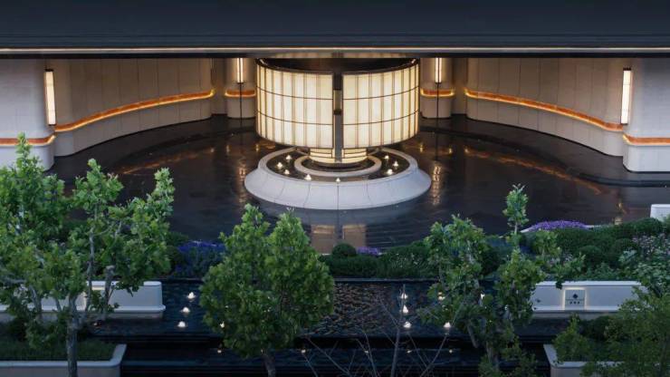 双轴线的设计,充分拓宽了视野面与观赏点位,环形回廊、精神游廊与下沉庭院通过立体景观平台相融,又创造出隔岸听泉的诗意场景。