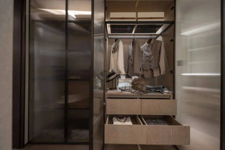 小户型最让人担心的小户型的收纳问题招商序给出了自己的解题思路,让我们看看它的收纳空间,首先是一整排的玄关收纳,玄关柜据说可以放下28双高筒靴,而且是大理石的台面石,另一侧的储物柜是一个容量较大的落地柜,足够收纳一个大行李箱,背面还贴心设置了洞洞板,可以悬挂雨伞、包包等物品,整个玄关柜是天然木皮鸡翅木包裹,非常高级,预留S墙的设计轻松收置双开门冰箱、厨房与卫生间采用了模块化的收纳系统,通过碗碟拉篮、谷物抽、不锈钢开架,贯穿式镜柜与美妆冰箱等收纳道具,将日常用品归置的仅仅有条,114主卧更是预留了超大的衣柜空间。