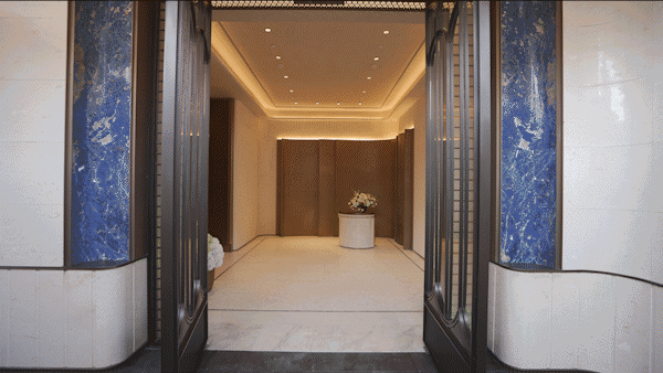 门庭延街的外立面,以精工定制弧形 米色石材 为主调,镶嵌典藏级 老虎玉大理石 ,点缀 古铜色现代海派艺术感 灯器,整体呈现出百年海派的贵雅气质。