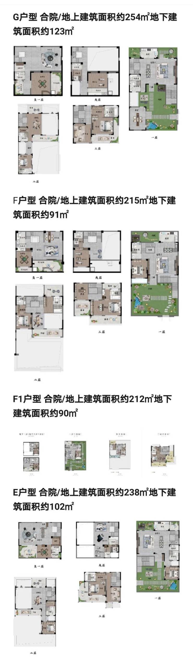 合院:3层,建面306-377㎡,带庭院及地下室,强调私密性