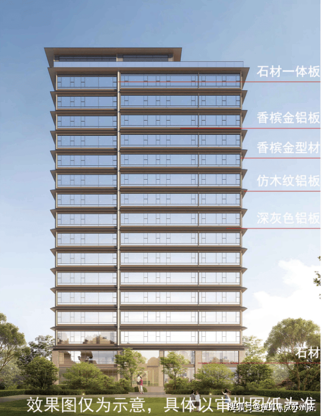 其中,小高层外立面采用全铝板、石材、石材一体板搭配南向大面积玻璃幕墙;