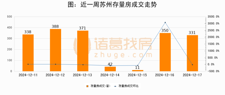 从存量房来看,2024年12月17日苏州存量房单日成交331套,比昨日减少19套,环比下降5.4%。从近一周存量房成交来看,苏州存量房日均成交套数为261套,12月17日单日成交331套,高于近一周平均水平26.8%。