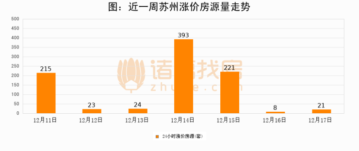 根据诸葛找房数据显示,苏州24小时涨价房源量为21套,较12月16日增加13套,环比上涨162.5%。与此同时,涨价房源占比小幅扩大,业主信心有所提升。