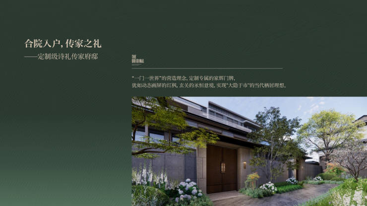 别墅为湖居合院,共五层(地面3层地下2层),通过定制门徽、屏风和灯具营造诗礼家风的仪式感。内部设计依户型不同分为三面围院和南北分院,以现代东方手法打造宁静平和的院落生活。
