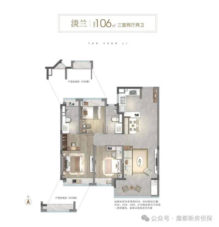 106㎡3房则做到“真三房”,不是市面的“2+1”,而是每个房间都能做卧室;约3.45米客厅面宽、开放式可视厨房、南向大阳台,让家庭公共活动空间更显开阔。