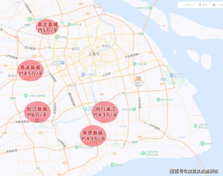 可以看现在上海房价地图,单价4万/平的房价,如今只有五大新城以及低于五大新城的区域: