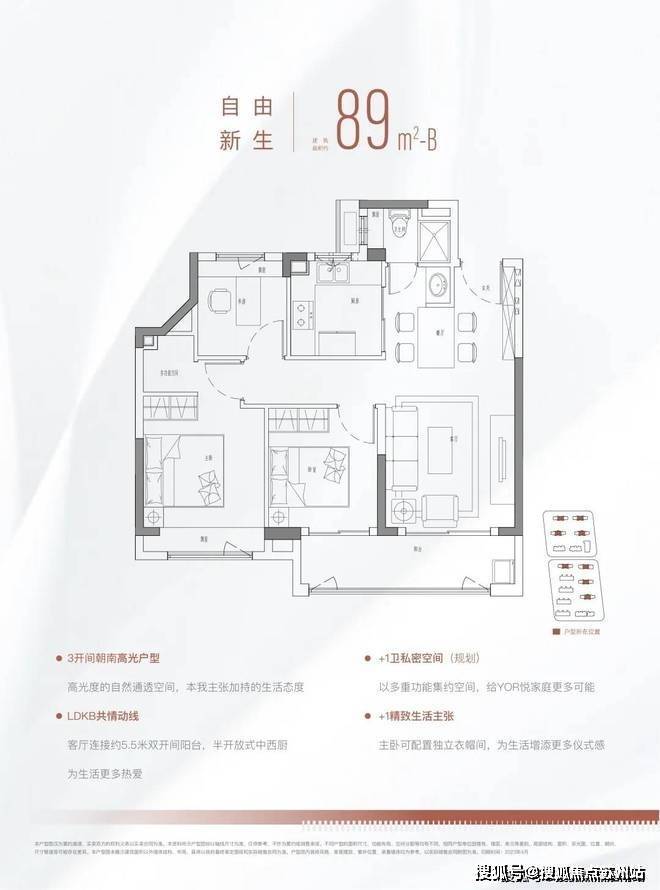 不同于一般的三房把这个小房间直接做了主卫,这个项目把选择权留给了购房者,并在下方铺设了上下水管、相当人性化!除了以上亮点之外,这个户型还有惊喜小细节。为了解决爱买买买的年轻人收纳痛点,户型设计上保留了厨房最大的收纳空间,可以打双组吊柜。在主卧和次卧都预留了收纳柜的位置。除了三开间朝南的经典户型,89m²还做了三面通风的户型。