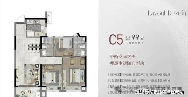 C5户型、建面约99㎡,三房二厅二卫